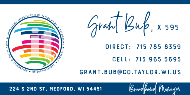 For more information about Taylor County Broadband Project, contact Taylor County Broadband Manager, Grant Bub, below.